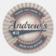Thank You Baseball Stickers features a vintage style baseball illustration, customised with name, underlined by a swash. This design include elements of blue, red, a baseball, banners and a starburst background. Template for personal customisation, including age or player number.