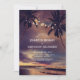 Romantic vintage beach sunset engagement party invitation with purple palms and string lights.