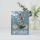 Vintage bicycle girl wearing a red cap and blue dress . Antique graphic image with great details . It comes with blue bokeh background and the words "Happy Birthday " in white fonts .
