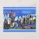 This postcard features a vintage illustration of "Wisconsin" in big letters.