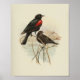 Vintage 1923 bird illustration. Red and black bird sitting on a reed.