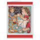 A vintage birthday card image for a Granddaughter features a little girl in red dress, red shoes and a white apron with her hair in braids. Her doll sits in a high chair, and the little girl is serving the doll a piece of birthday cake with one candle in it. Kitchen baking utensils are on the floor and an oven in the background. On a chalkboard are these words, "To a Sweet Granddaughter on Her Birthday." The message inside the card is: "Hugs and kisses and Happy Birthday wishes!"