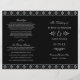 Ornate silver and black art deco patterns create a dramatic ceremony program brimming with vintage glamour. Geometric borders and a decorative ampersand frame "The Wedding Of" in elegant typography against a striking black background, with a coordinating deco patterned backing. Inside pages are fully customizable for your bridal party, ceremony order, and a personal thank you message on the back cover. Programs are printed on text-weight paper and arrive flat, requiring a simple center fold.