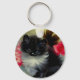 Keychain featuring a playful black and white kitten! This fluffy tuxedo cat poses amongst red flowers on a blue blanket. A superb gift for cat lovers and Victorian art enthusiasts!