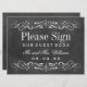 Decorative swirls and flourishes frame this elegant vintage inspired wedding guest book sign with white text and monogram. Background has a textured black chalkboard appearance.