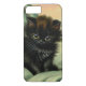 iPhone Case featuring a loveable black kitten! The green eyed kitten sits on a blanket with a pink flower. A beautiful gift for cat lovers and Victorian art enthusiasts!