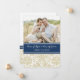 Elopement announcement photo cards in elegant dark navy blue, light beige sandy brown and white delicate floral damask pattern, fully customisable with your names, wedding photo and wedding details, the perfect way to announce that you have eloped to friends and family. Available in a wide range of matching wedding products.