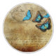 A unique and beautiful vintage-inspired design with a brown/tan background and four bright blue butterflies. There are wonderful elements including a teapot, scrollwork, and writing