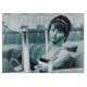 3D digital render of a beautiful young vintage woman sitting in a car on a background of a summer city, blue coloration