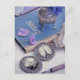 Photo "Vintage Blue Paris" features two antique brooches with black and white photographs of the famous Eiffel Tower and Sacré Coeur cathedral in Paris, France next to an old book about German philosopher Leipzig with a purple fountain pen and some flower petals.