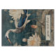 vintage painting of a botanical scene with a blue crane surrounded by white lotus flowers