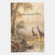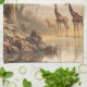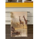 Vintage botanical painting of three giraffes by a river in the jungle during sunset