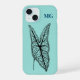 Beautiful and elegant Acqua Turquoise Phone Case depicting a vintage botanical illustration of a detailed Heart of Jesus (Caladium Belleymel) plant leaf. Personalise with your monogram or initials in a stylised royal blue font and even change the background colour.