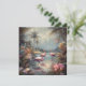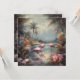 botanical painting with flamingos standing in the water surrounded by palm trees and tropical flowers