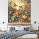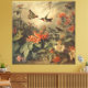 vintage painting of a botanical scene with hummingbirds, flowers and trees
