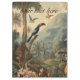 vintage painting of a botanical scene with parrots and butterflies flying around. Palm trees on the sides with a mountain in the background. Tropical flowers on the front