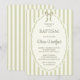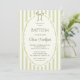 This invitation features a clean, understated design with a soft sage green stripe pattern background that gives it a classic tailored look. A centered oval with a wavy hand drawn border and a bow gives this invitation a vintage look, while the mix of serif, sans serif and script typography adds a touch of elegance without feeling formal. The muted color palette lend a calm, traditional feel, resulting in a style that is refined, minimal and quietly romantic.