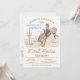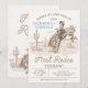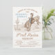 First rodeo themed first birthday invitation for twin boys featuring a cowboy and horse, desert landscape, and some rope style text. This boy's first rodeo birthday invitation is ideal for anyone looking for a vintage style invitation for twins.