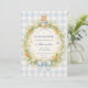 A charming vintage baby shower design featuring a sweet watercolor bunny resting above a delicate spring garden wreath. Soft daisies, greenery, and tiny carrots form a whimsical botanical frame, finished with a gentle ribbon bow and a soft blue gingham background. The storybook illustration style and pastel countryside palette create a timeless cottagecore aesthetic that feels warm, playful, and perfect for celebrating a new little arrival.
