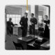 Vintage illustration black and white business office scene featuring a typical professional office with businessmen, businesswomen, men, women and admin workers performing their daily mundane paperwork and administrative tasks at their desks. Manual typewriters, printers and fax machines are in use.