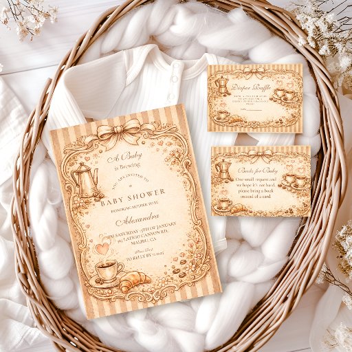 Celebrate a sweet new arrival with this vintage-inspired coffee baby shower design, featuring hand-drawn espresso details, warm sepia tones, and an elegant storybook frame. The cozy café aesthetic is perfect for a relaxed, intimate gathering with a timeless European feel. Ideal for coffee lovers, neutral baby showers, and classic celebrations with a warm, nostalgic charm.