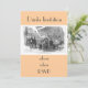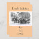 Invitation card featuring a vintage engraving in black and white of a busy street cafe scene on Boulevard Montmartre Paris, France, circa 1870.
