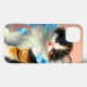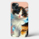 iPhone Case featuring a cute calico kitten. The kitten wears a blue ribbon while sitting adorably on a table. A perfect gift for cat lovers and Victorian art enthusiasts!