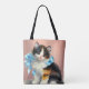 Tote Bag featuring a cute calico kitten. The kitten wears a blue ribbon while sitting adorably on a table. A perfect gift for cat lovers and Victorian art enthusiasts!