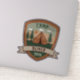 This personalised sticker features a scout-style badge with a cosy tent among tall pine trees. The shield-shaped badge showcases a customised name banner. With earthy retro hues, this adventure-ready design is perfect for kids' camping trips, birthdays, or summer camp keepsakes.