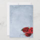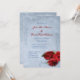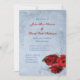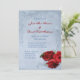 Elegant vintage cascade blue wedding invitation design featuring decorative corner scrolls on the top and bottom with a photo of three red roses in the lower corner. The background is given a textured grunge application for an antique paper look. This design comes in several ready made backgrounds. This design also comes on many other stationery products to suit all your wedding set needs.