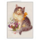 A vintage illustration of a beautiful, fluffy cat wearing a gold ribbon and bow. The cat sits with a basket of purple, pink and white flowers at its feet and looks directly at you as if saying, "These are for you!" This card is blank inside for your own message.