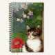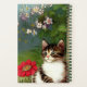 Notebook featuring a cute kitten illustration. A white cat with dark brown stripes relaxes in a garden of spring flowers. A perfect gift for cat lovers!