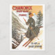 This postcard is a reproduction of a vintage travel poster for skiing in Chamonix, France.