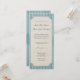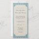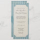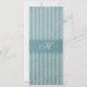 This design features a dusty blue striped background, and a simple, elegant ticket-like cream frame placed over a darker blue ribbon. The text alternates between classic Garamond and script wedding fonts, with an added script flourish for style in between the wedding date and location. The design has been given a distressed, aged feel to complement the vintage design. A custom monogram initial in cream ties the back of the invitation card into the overall design. These invitations are classic but not overly formal, exuding a vintage, old-fashioned charm with a contemporary sweetness and style.
