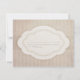 This wedding invitation response card features a striped cream background on which a darker cream ribbon bears a white emblem with scalloped edges. This curved, symmetrical form, which looks like a paper cut-out, frames the words "Kindly respond [by - customisable date]" with a swirly script flourish on the front. On the back is a line for the guest to write their name and check whether they accept or decline, and the number of guests attending. The design has a distressed, vintage, aged feel which complements the theme of simple, old-fashioned elegance.