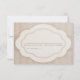 This wedding invitation response card features a striped cream background on which a darker cream ribbon bears a white emblem with scalloped edges. This curved, symmetrical form, which looks like a paper cut-out, frames the words "Kindly respond [by - customisable date]" with a swirly script flourish on the front. On the back is a line for the guest to write their name and check whether they accept or decline, and the number of guests attending. The design has a distressed, vintage, aged feel which complements the theme of simple, old-fashioned elegance.