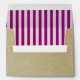 This vintage style, charming design features an aged, textured, and distressed dark ivory outside, while the inside is of vertical aubergine purple and cream stripes, giving the envelope a fanciful, stylish feel. The back flap has a ticket-like outline framing your name(s) and return address. The front has been left blank for addressing and postage. This envelope was designed for a matching wedding invitation.