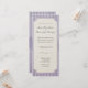 This design features a dusty lilac purple striped background, and a simple, elegant ticket-like cream frame placed over a darker lilac ribbon. The text alternates between classic Garamond and script wedding fonts, with an added script flourish for style in between the wedding date and location. The design has been given a distressed, aged feel to complement the vintage design. A custom monogram initial in cream ties the back of the invitation card into the overall design. These invitations are classic but not overly formal, exuding a vintage, old-fashioned charm with a contemporary sweetness and style.