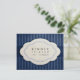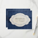 This wedding invitation response card features a striped dark blue background on which a navy blue ribbon bears a white emblem with scalloped edges. This curved, symmetrical form, which looks like a paper cut-out, frames the words "Kindly respond [by - customisable date]" with a swirly script flourish on the front. On the back is a line for the guest to write their name and check whether they accept or decline, and the number of guests attending. The design has a distressed, vintage, aged feel which complements the theme of simple, old-fashioned elegance.
