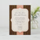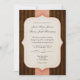This design features a chocolate brown striped background, and a simple, elegant cut-out cream frame placed over a textured, pale pink ribbon. The text alternates between classic Garamond and script wedding fonts, with an added script flourish for style in between the wedding date and location. The design has been given a distressed, aged feel to complement the vintage design. A custom monogram initial in its own, smaller frame ties the back of the invitation card into the overall design. These invitations are classic but not overly formal, exuding a vintage, old-fashioned charm with a contemporary sweetness and style.