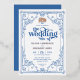 A whimsical foil wedding invitation featuring hand-drawn vintage chinoiserie motifs and intricate French Baroque detailing,