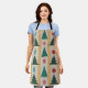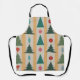 This apron has mid-century modern design of Christmas trees and ornaments strung on a garland with a gold and silver background.