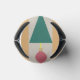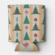 This can cooler has mid-century modern design of Christmas trees and ornaments strung on a garland with a gold and silver background.