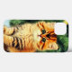 iPhone Case featuring a vintage Christmas cat! An orange kitty with black stripes sits in the snow. Behind the cat is a Christmas tree with red and yellow ornaments. Also on the snow is a red present. A perfect gift for the Christmas season and cat lovers!