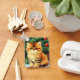 Keychain featuring a vintage Christmas cat! An orange kitty with black stripes sits in the snow. Behind the cat is a Christmas tree with red and yellow ornaments. Also on the snow is a red present. A perfect gift for the Christmas season and cat lovers!