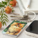 Keychain featuring a vintage Christmas cat! An orange kitty with black stripes sits in the snow. Behind the cat is a Christmas tree with red and yellow ornaments. Also on the snow is a red present. A perfect gift for the Christmas season and cat lovers!