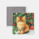 Magnet featuring a vintage Christmas cat! An orange kitty with black stripes sits in the snow. Behind the cat is a Christmas tree with red and yellow ornaments. Also on the snow is a red present. A perfect gift for the Christmas season and cat lovers!