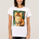 T-Shirt featuring a vintage Christmas cat! An orange kitty with black stripes sits in the snow. Behind the cat is a Christmas tree with red and yellow ornaments. Also on the snow is a red present. A perfect gift for the Christmas season and cat lovers!