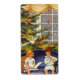 Vintage illustration Victorian Christmas holiday image featuring happy siblings sitting on a couch. A brother and sister on a sofa have a decorated Christmas tree and window behind them. The girl is reading a book and the boy is eating a candy cane. Text reads "A Merry Christmas."