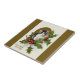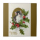 A Grey and White Christmas Kitten is framed in gold with holly and berries. Message: Christmas Greetings. Image of a Vintage Postcard Graphic on a custom gold background.